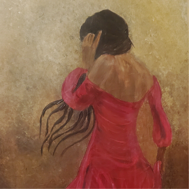 A call to action, Leigh paints a number of pieces depicting indigenous women wearing a red dress. She describes this piece as a means to create awareness of the tragedy of Missing and Murdered Indigenous Women.